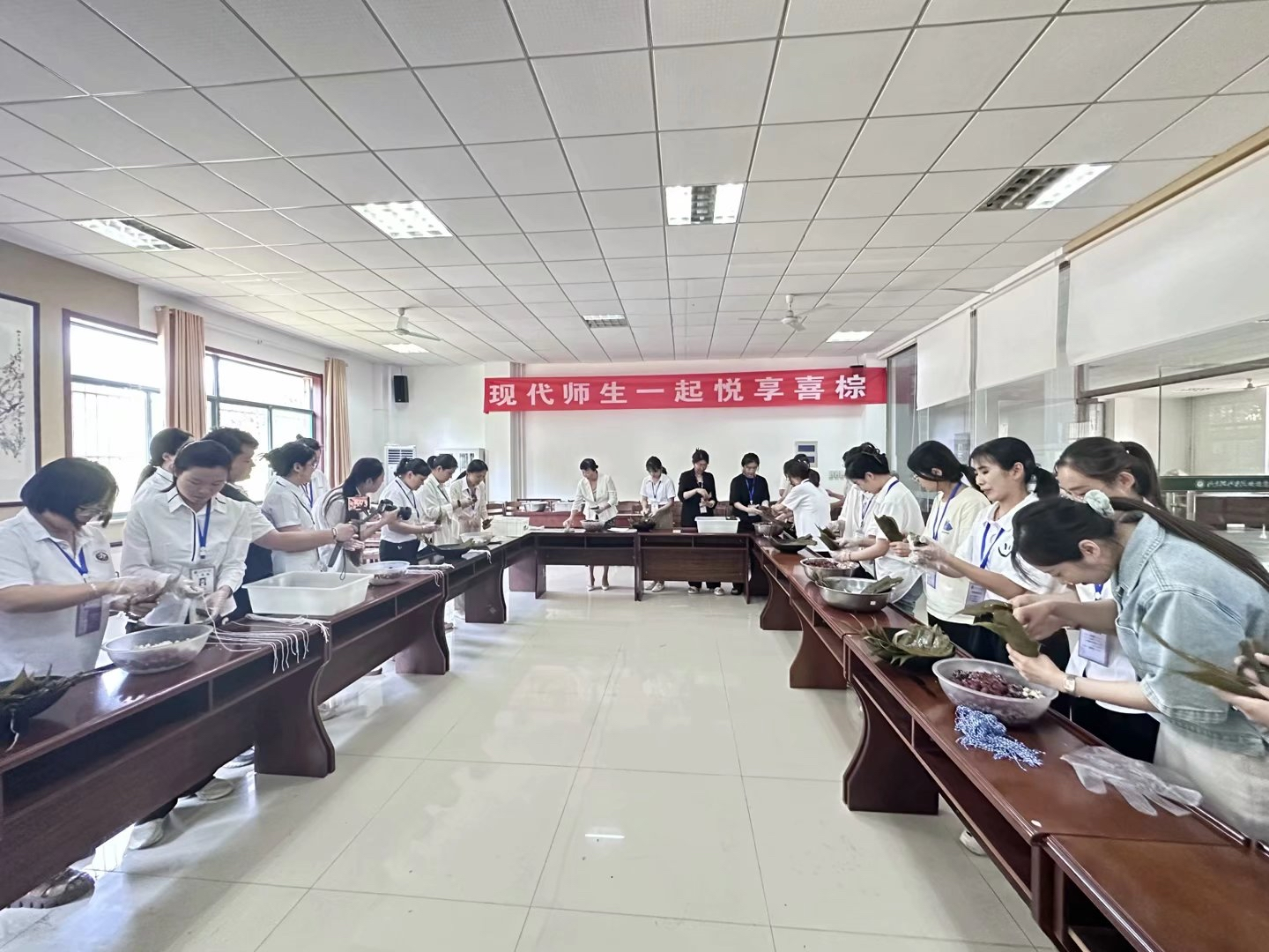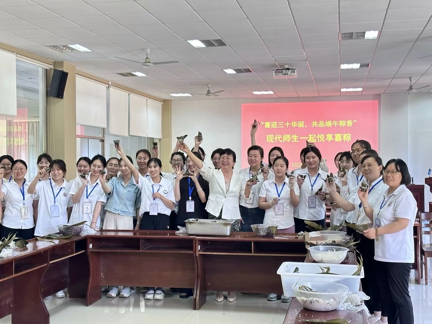 为弘扬中华民族传统节日文化,感受端午节丰富的文化内涵,引导师生传承、弘扬民族精神,坚定文化自信,激发爱国情感,6月25日下午,人事处在立德楼一层活动室组织开展“喜迎三十华诞,共品端午粽香”现代职工一起悦享喜粽活动。山东现代学院董事长、校长刘春静出席活动,与我校各岗位教职员工亲切交谈,共享快乐祥和的端午佳节。
