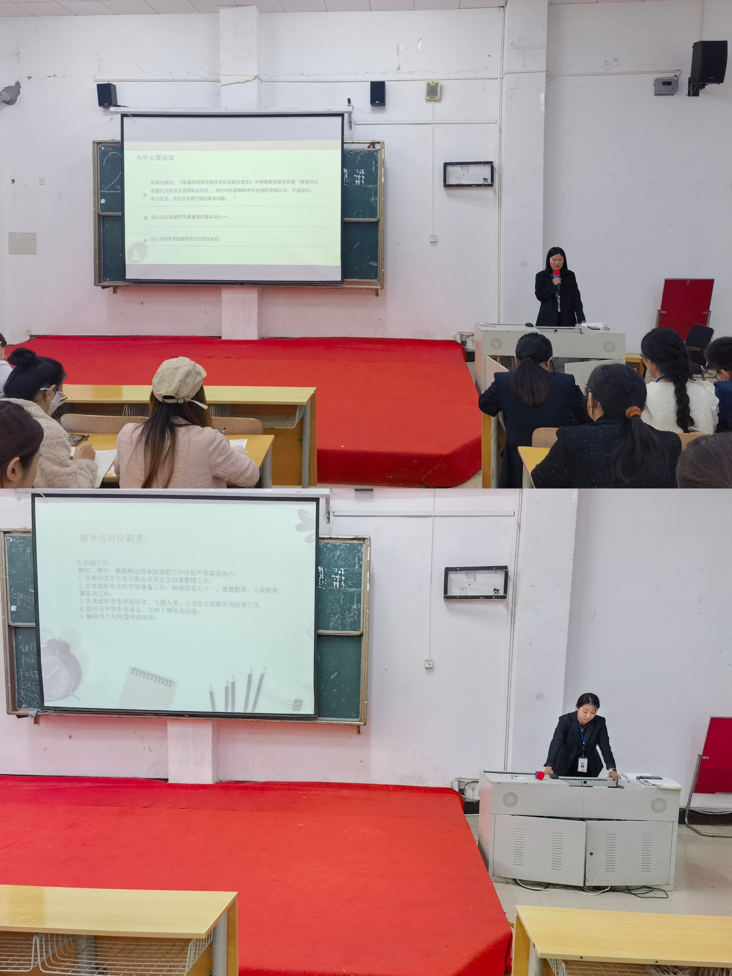 培训邀请到人文与管理学院办公室主任唐淼青、护理学院办公室主任王会芳作交流分享,涵盖大学生思想政治教育、心理健康教育、职业生涯规划、班级建设等内容。
