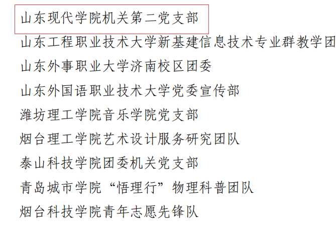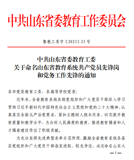 2023年10月18日,山东省委教育工委印发《关于命名山东省教育系统共产党员先锋岗和党务工作先锋的通知》(鲁教工委字〔2023〕23号),我校机关第二党支部获评山东省教育系统共产党员先锋岗。