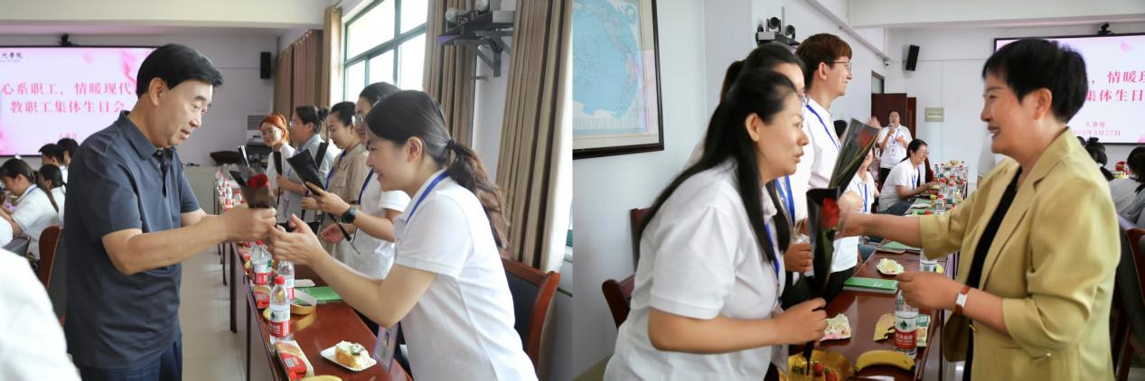 党委副书记兼副校长帅相志、校长助理史德焕代表刘春静董事长,为庆生的教师们送上鲜花和生日的祝福。