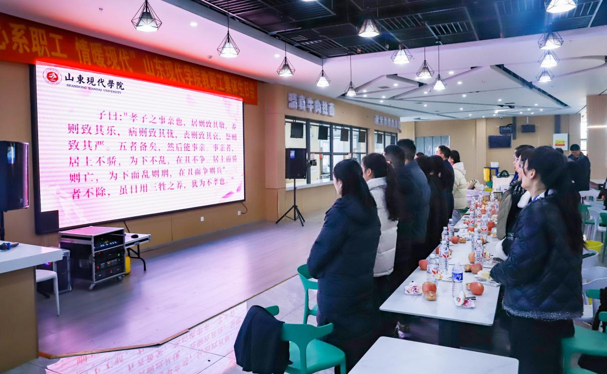 游戏互动环节随即展开,“击鼓传花” 与才艺展示交替进行。教职工们踊跃参与、各展所长,欢笑声与掌声交织,进一步拉近了彼此的距离;随后的集体诵读国学经典《孝经・纪孝行章第十》环节,全体教职工手持文本、声情并茂,在传统文化的浸润中感悟孝德精神,也彰显了学校对教职工精神文化层面的关怀。